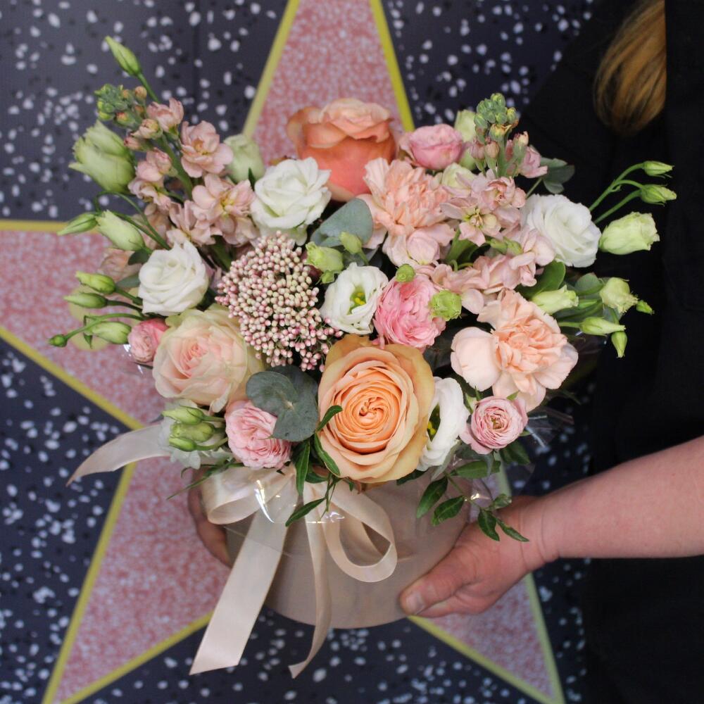 Маттиола априкот – 2 шт.Эустома – 1 шт.Роза пионовидная кахала – 2 шт.роза фрутетто – 1 шт.Роза кустовая пионовидная мадам бомбастик – 1 шт.Озотамнус – 1 шт.Диантус – 3 шт.Фисташка – 1 шт.Эвкалипт – 1 шт.Пленка прозрачная – 1 шт.Лента атласная – 1 шт.Оазис флористический – 1 шт.Шляпная коробка – 1 шт.