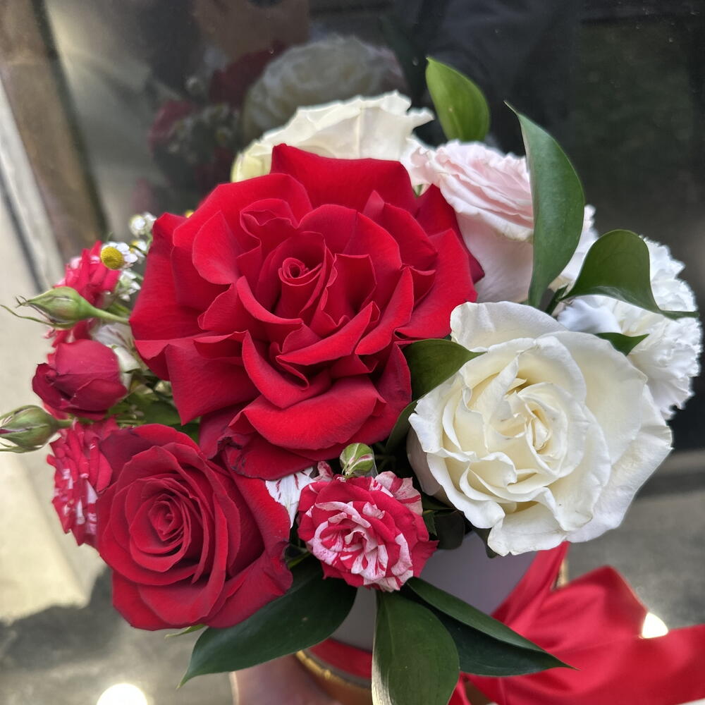 Роза – 4 шт. Кустовая роза – 2 шт. Зелень – 1 шт. Диантус – 2 шт. Коробка шляпная – 1 шт. французская красная роза – 1 шт.