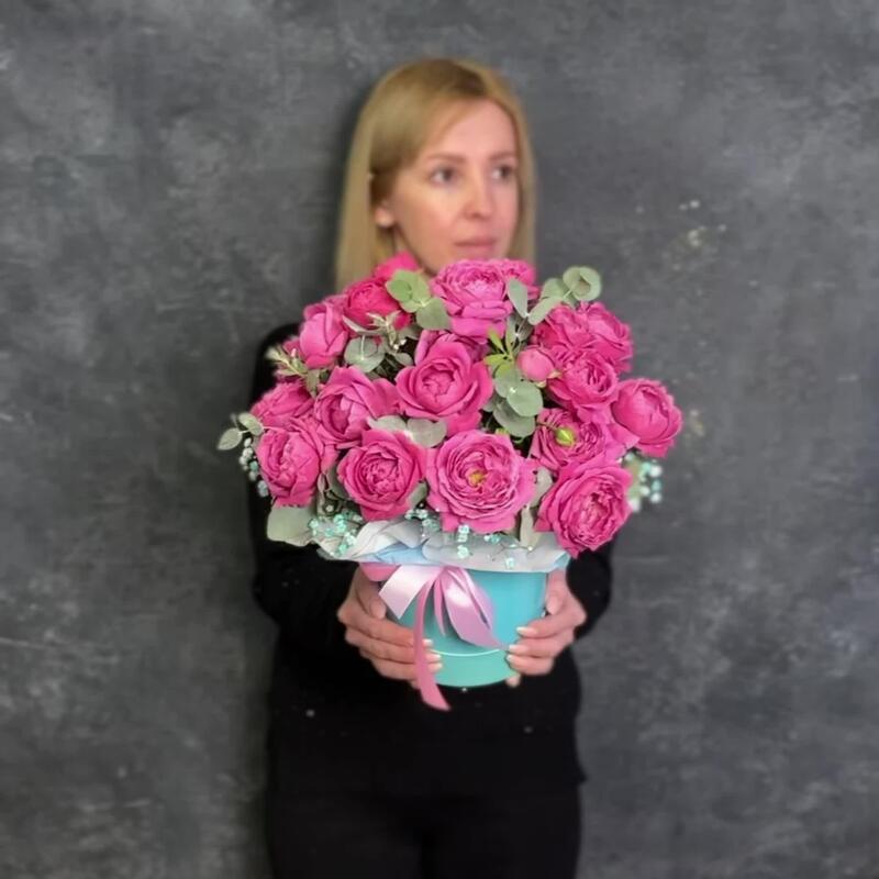 Цветы в коробке кустовые пионовидных розы с эвкалиптом