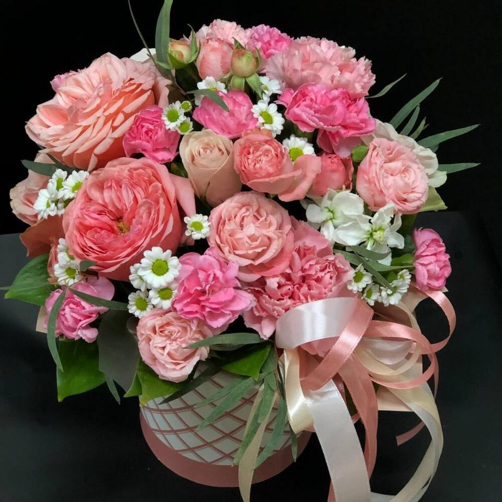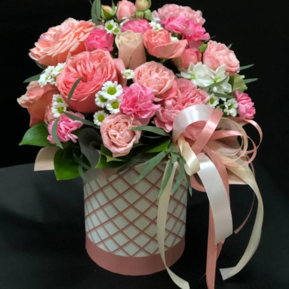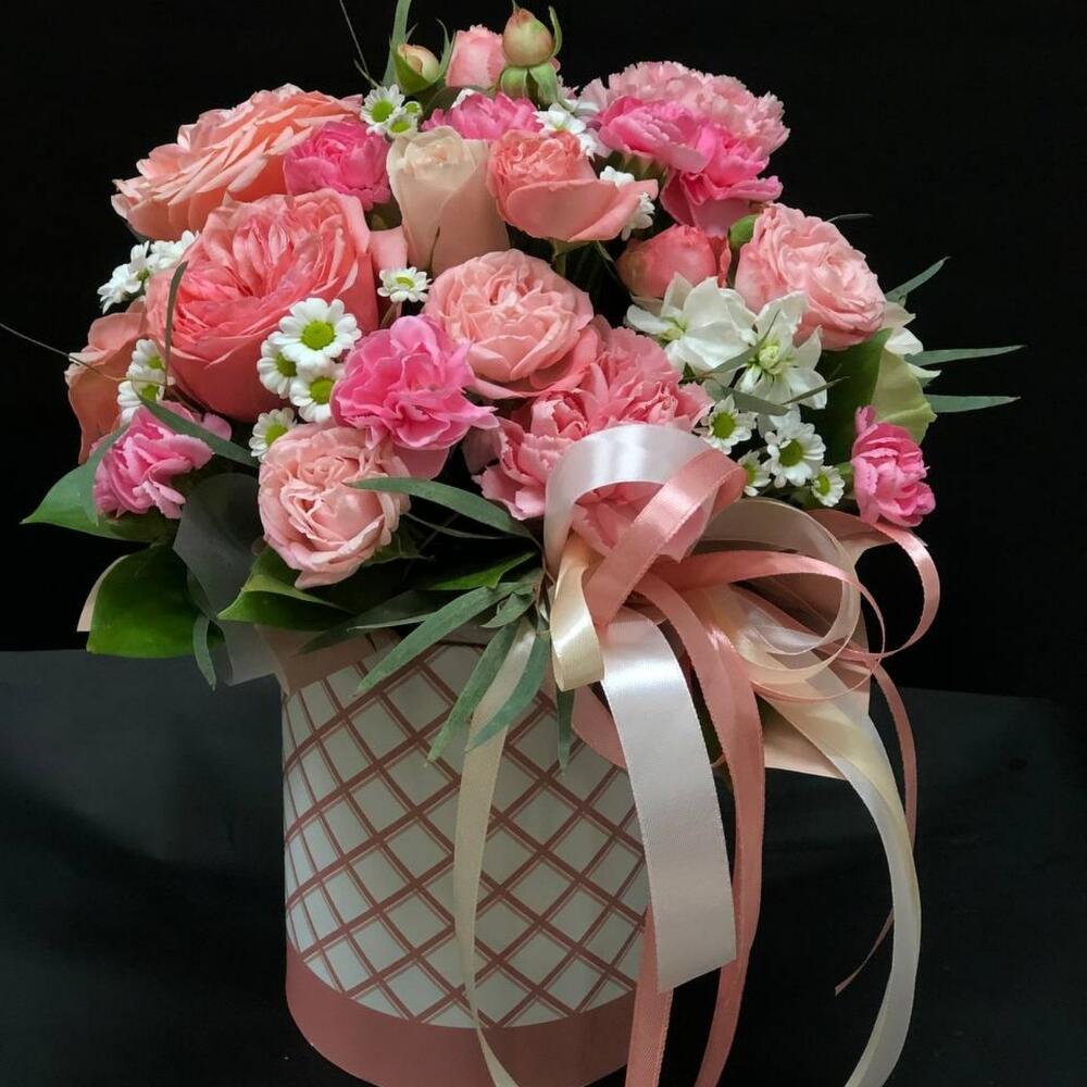 Роза – 5 шт.Роза Кенийская – 1 шт.Роза кустовая – 2 шт.Диантус – 3 шт.Диантус кустовой – 3 шт.хризантемы – 2 шт.Эвкалипт – 2 шт.Рускус – 5 шт.Оазис флористический – 1 шт.Лента атласная – 3 шт.Коробка шляпная – 1 шт.