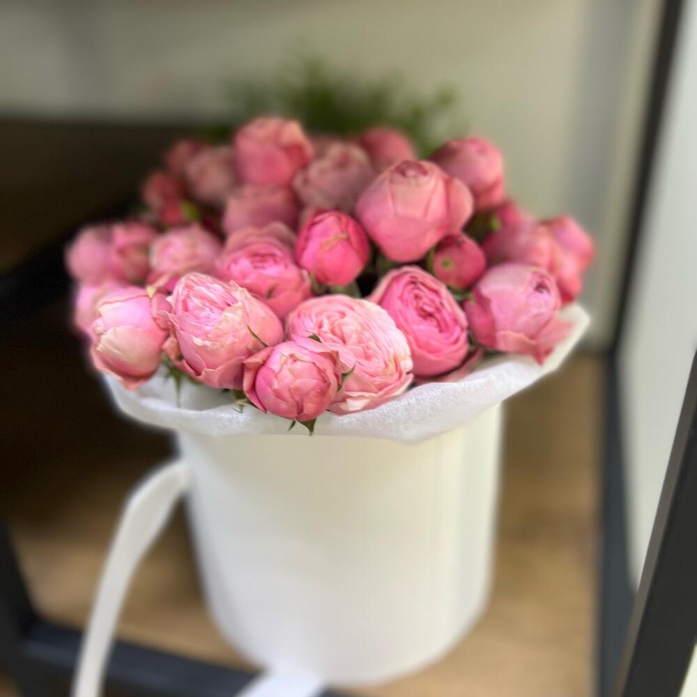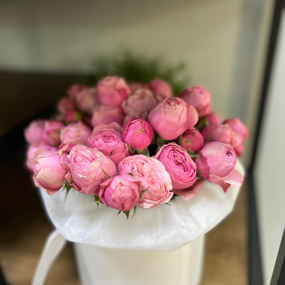 Пионовидная роза кустовая – 11 шт.Шляпная коробка – 1 шт.Аквапак – 1 шт.Тишью – 1 шт.