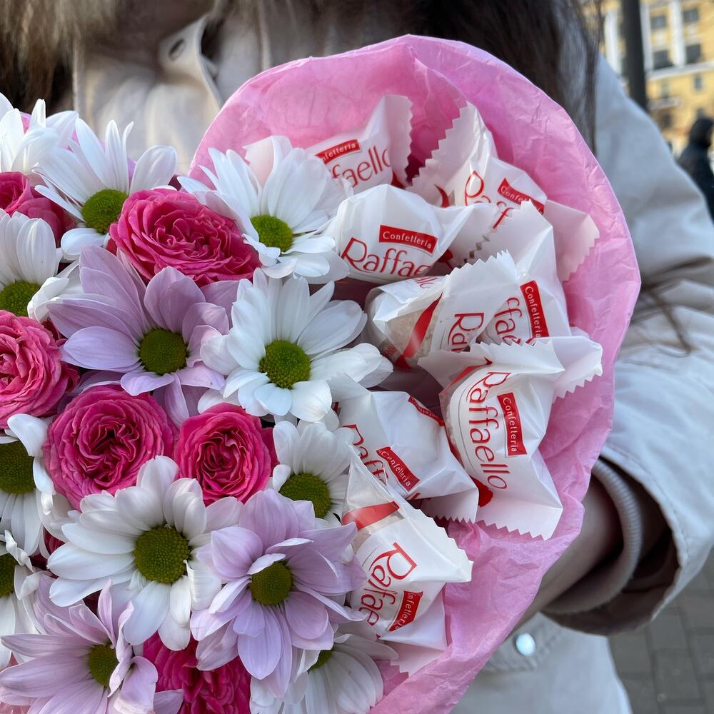 Хризантема кустовая – 2 шт.Кустовая роза – 1 шт.раффаэлло конфеты – 8 шт.Бумага тишью – 1 шт.Коробка сердце – 1 шт.Оазис флористический – 1 шт.