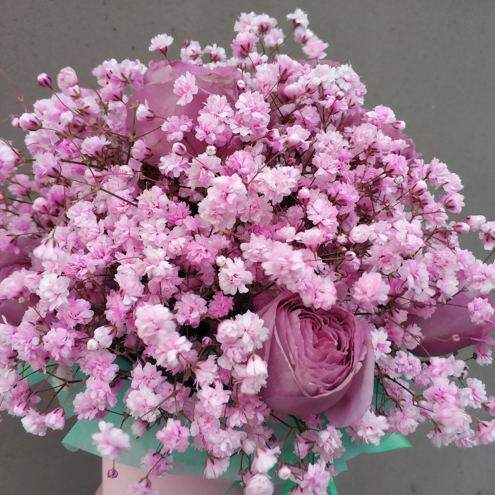 Роза кустовая пионовидная – 5 шт.Гипсофила розовая – 3 шт.Коробка d12 – 1 шт.Оазис – 1 шт.Упаковка – 1 шт.Лента – 1 шт.