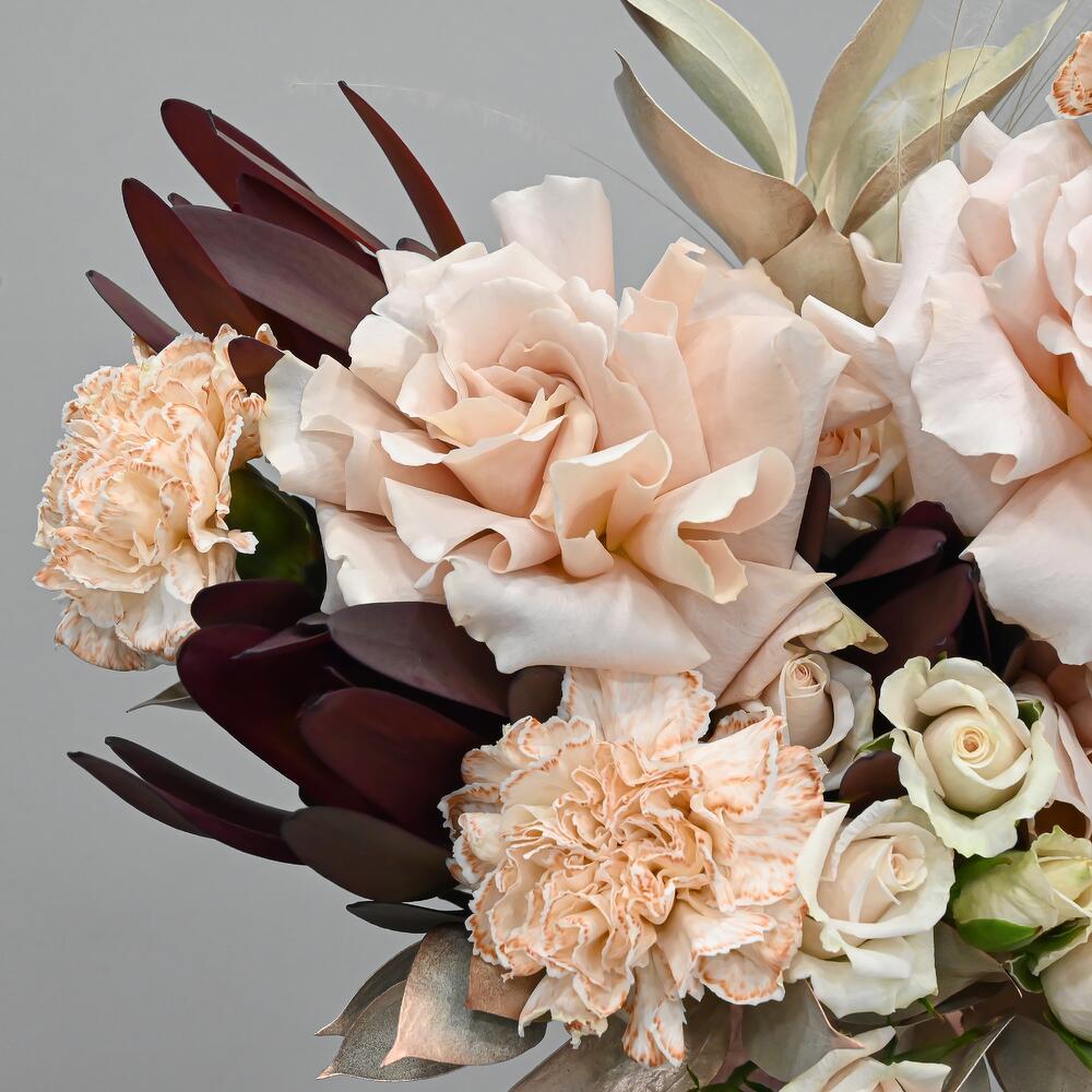 Элегантный свадебный букет в кремовой цветовой гамме. В составе французские розы, сортовая гвоздика, кустовая роза, экзотический леукадендрон и воздушная стифа.Флористы студии Цветочный Этикет собрали его из самых свежих цветов. Букет готов сиять красотой на всех фотография.