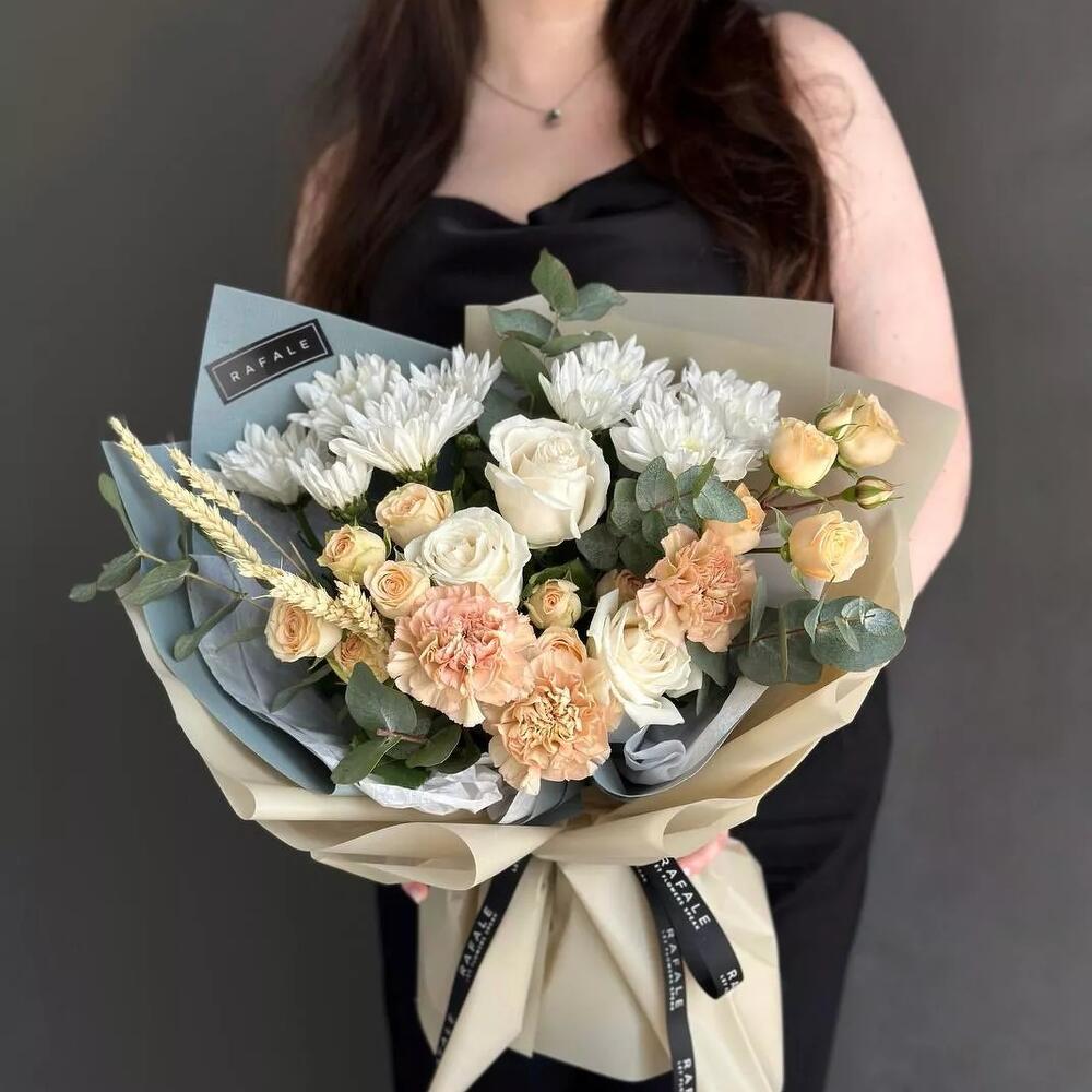 Сборный букет "EURO 18.3" состоит из голландских роз, гвоздик, кустовых хризантем, спрей роз, эвкалипта и пшеницы в оформлении. Выбрав букет от RAFALE, Вы скрасите день обладательницы букета и подарите ей незабываемые эмоции.
