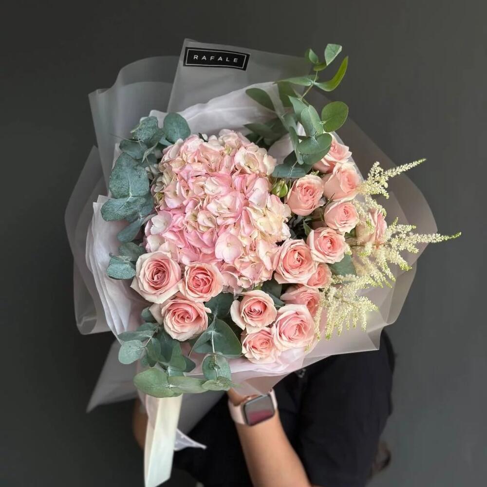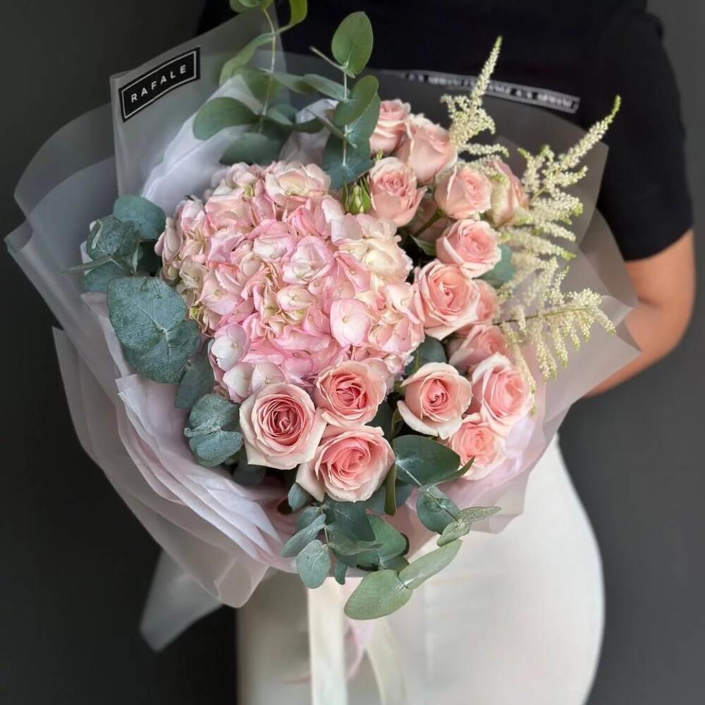Букет "EURO 60.0" состоит из 1 голландской гортензии, 5 спрей роз, 3 веток астильб и 1 ветки эвкалипта в оформлении. Выбрав букет от RAFALE, Вы скрасите день обладательницы букета и подарите ей незабываемые эмоции.