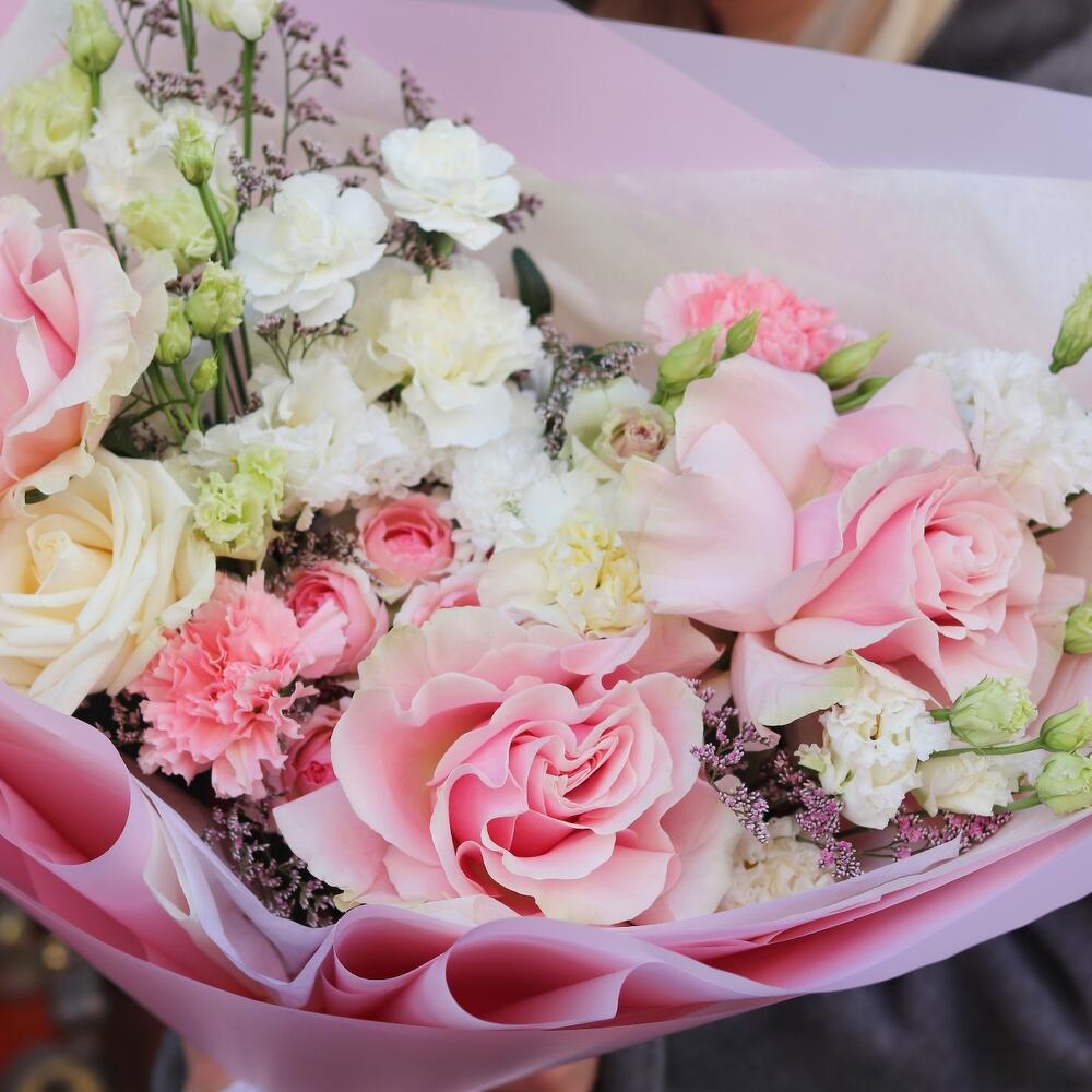 Лизиантус – 2 шт.Лимониум – 1 шт.Кустовая роза – 1 шт.Сантини – 1 шт.Пионовидная роза – 1 шт.Гвоздика сортовая – 5 шт.Французская роза – 3 шт.Открыточка с вашими пожеланиями – 1 шт.Шоколадка – 1 шт.Дизайнерская упаковка – 1 шт.