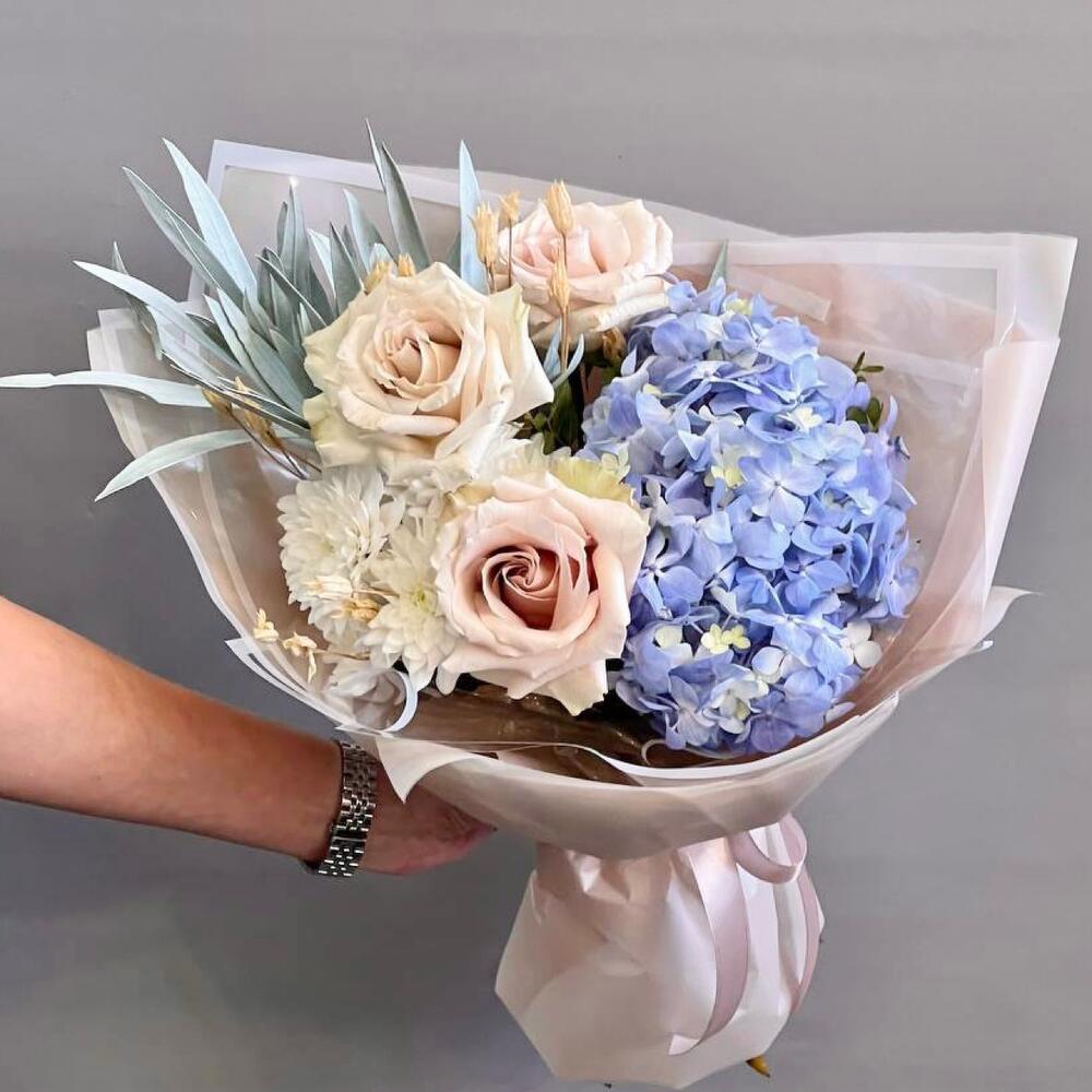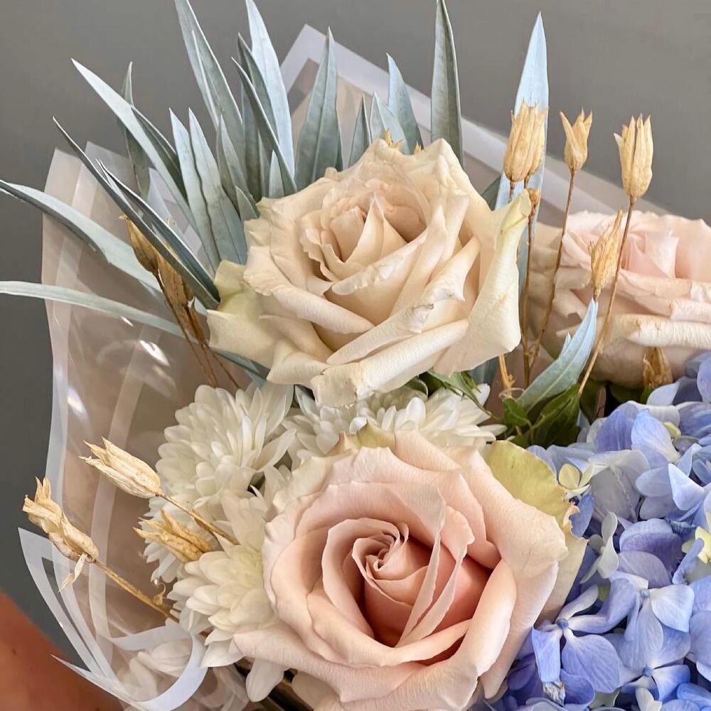 “Эвкалиптическая роскошь” гортензия и пионовидная кустовая роза