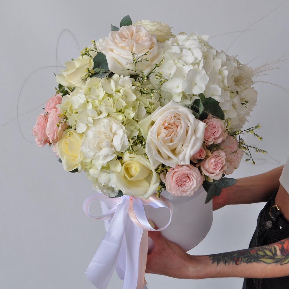 Коробка шляпная – 1 шт.Оазис флористический – 2 шт.Лента атласная – 2 шт.Гортензия белая – 2 шт.Гвоздика – 4 шт.розы кустовые пионовидные – 5 шт.Роза пионовидная – 5 шт.Роза Россия – 5 шт.Лимониум – 1 шт.Эвкалипт – 1 шт.Ковыль – 3 шт.