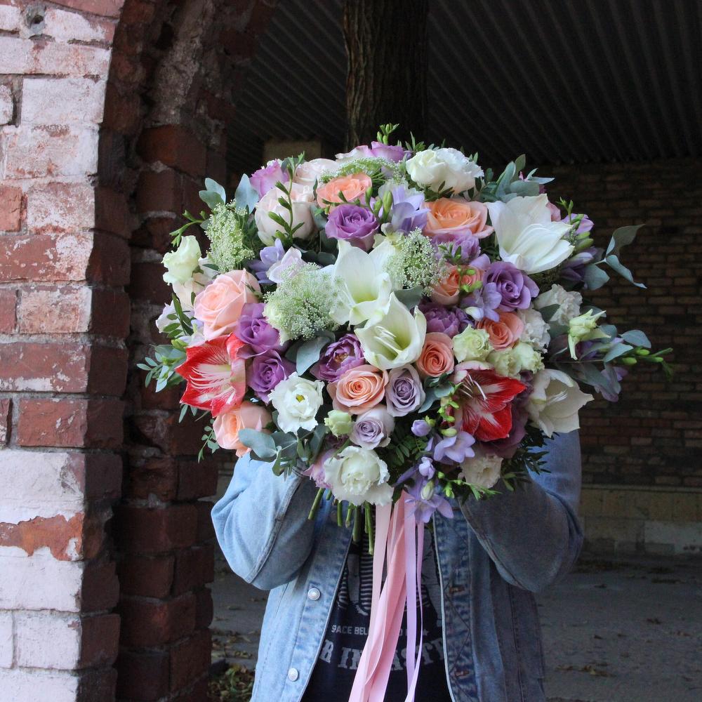 Амариллис – 5 шт.Роза Эквадор – 15 шт.Фрезия – 9 шт.Амми – 5 шт.Лизиантус – 11 шт.Эвкалипт – 11 шт.Фисташка – 7 шт.Тюльпан – 9 шт.Лента атласная – 3 шт.
