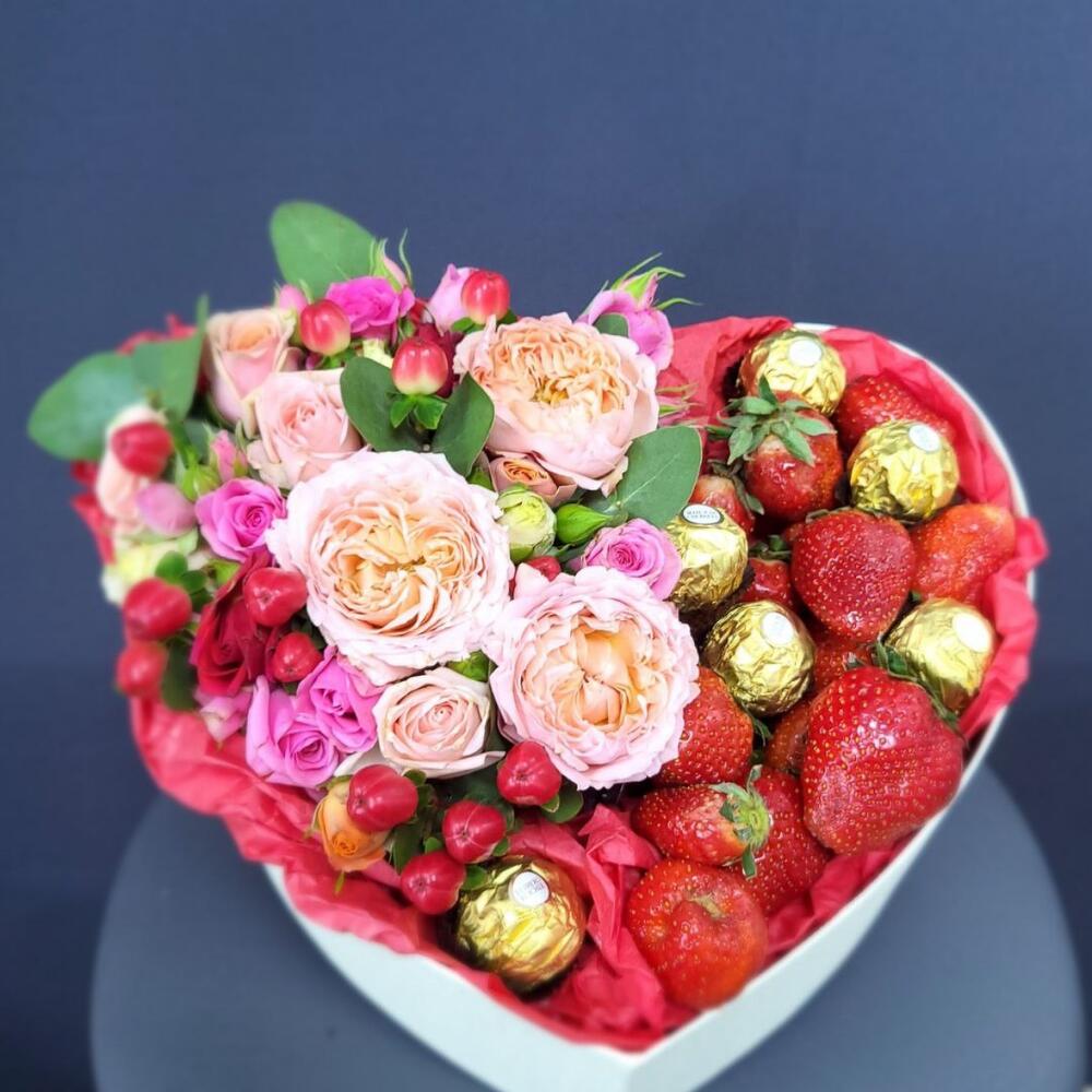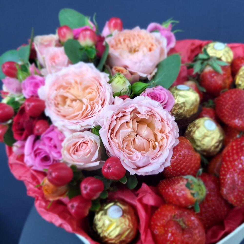 Клубничное безумие композиция из пион роз с клубникой