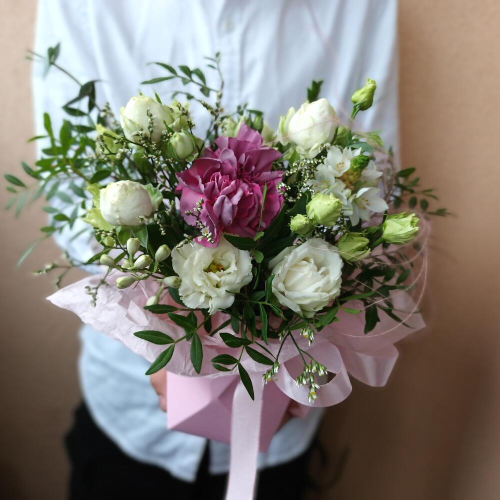 Коробка – 1 шт.Оазис флористический – 1 шт.Калька упаковка – 1 шт.Лента атласная – 1 шт.Диантус сортовой – 1 шт.Роза пионовидная кустовая – 1 шт.фисташка зелень – 1 шт.Стифа – 1 шт.Лимониум – 1 шт.Орнитогалум – 1 шт.эустома белая – 1 шт.