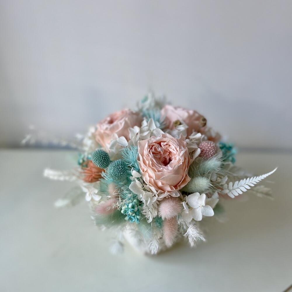Роза стабилизированная – 3 шт.Краспедия – 3 шт.Лагурус – 10 шт.гортензия стабилизированная – 1 шт.папоротник стабилизированный – 1 шт.Нигелла – 1 шт.цветы микс – 10 шт.Кашпо керамика – 1 шт.Коробка – 1 шт.Лента – 1 шт.