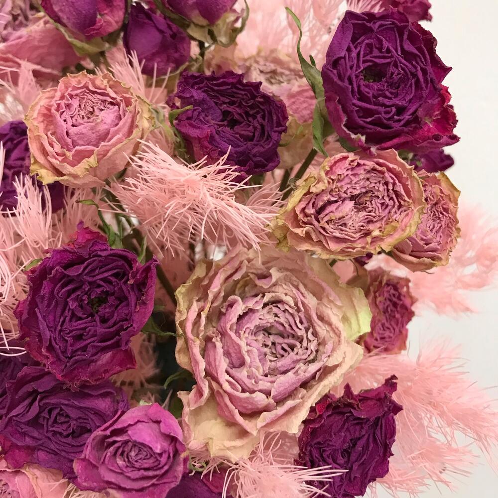 роза кустовая засушенная – 7 шт.аспарагус стабилизированный – 3 шт.Оазис флористический – 1 шт.стакан кофейный пластик – 1 шт.Лента атласная – 1 шт.