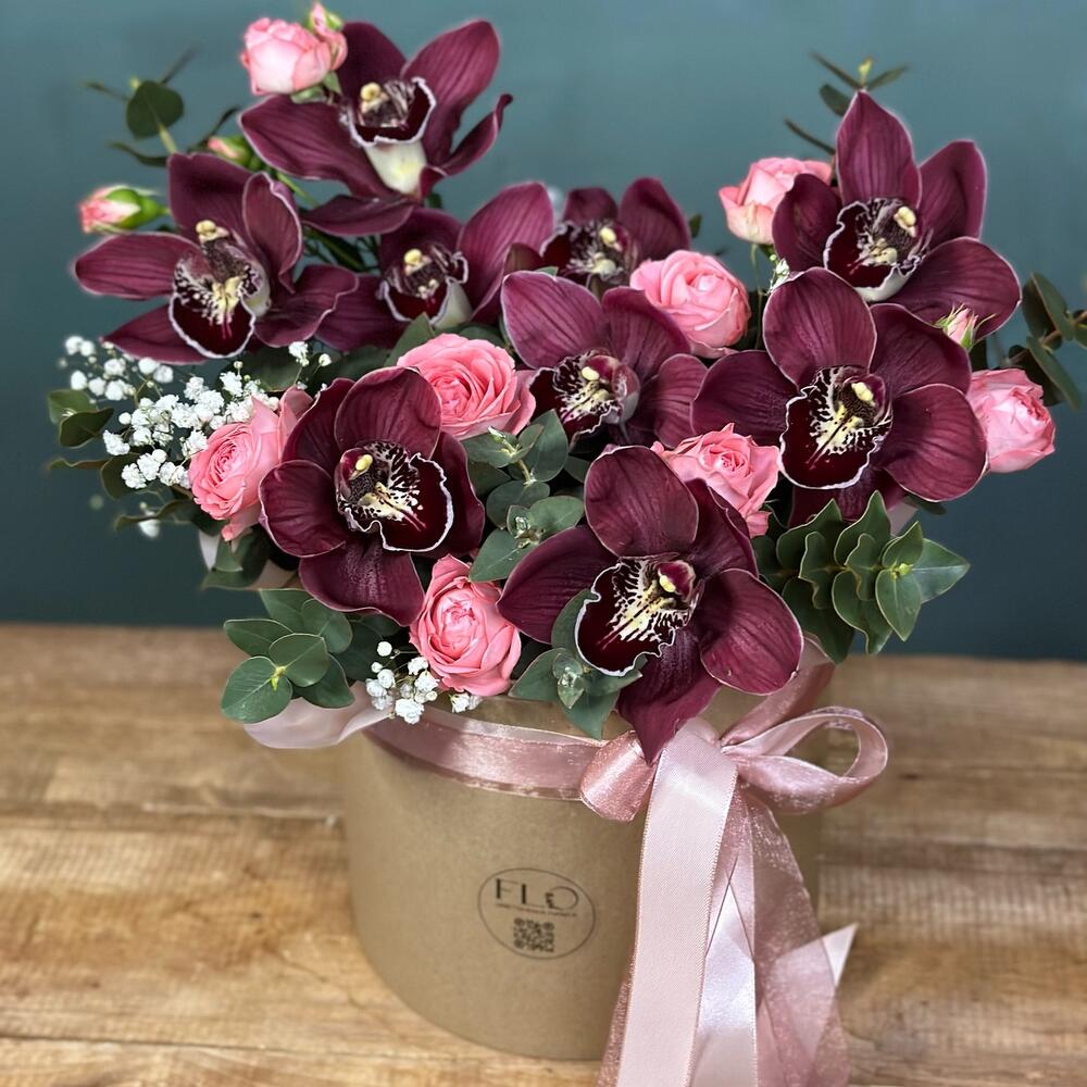 Гипсофила – 1 шт.Орхидея Цимбидиум – 9 шт.Эвкалипт – 4 шт.Лента атласная – 2 шт.Коробка шляпная – 1 шт.Роза кустовая пионовидная – 2 шт.