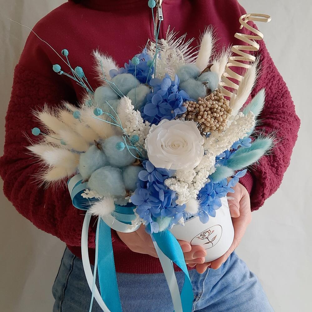 Роза стабилизированная – 1 шт.Хлопок натуральный – 3 шт.гортензия стабилизированная – 1 шт.лен натуральный пучок – 1 шт.лагурус (сухоцвет)пучок – 2 шт.озатомнус – 1 шт.перо декоративное – 1 шт.ветки декоративные – 25 шт.Оазис для сухоцветов – 1 шт.Кашпо картонное – 1 шт.Лента атласная – 3 шт.