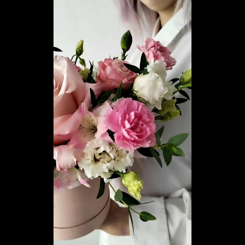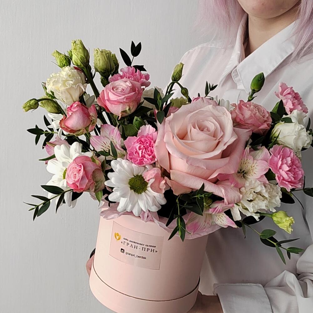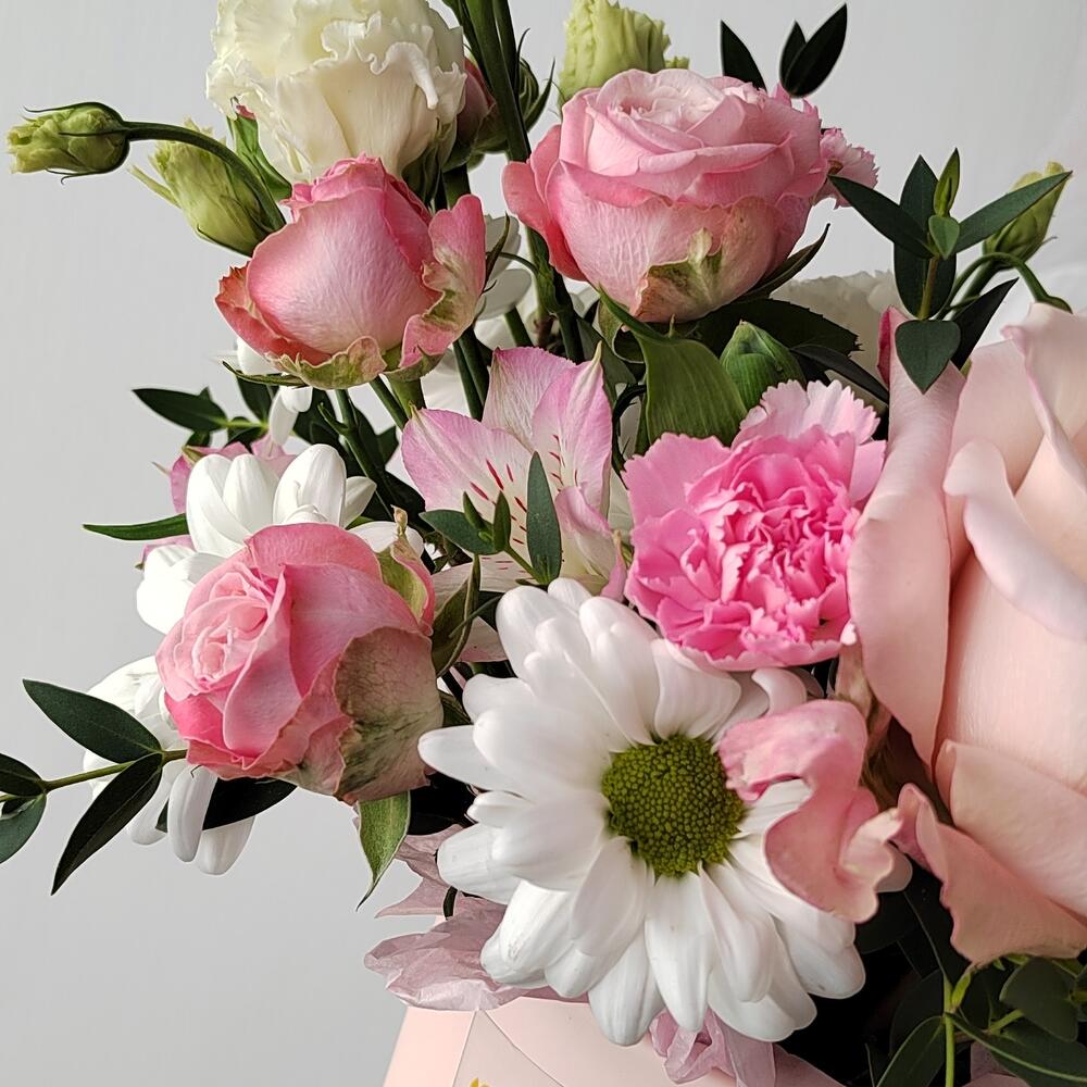 Роза кустовая – 1 шт.Хризантема кустовая – 1 шт.Роза – 1 шт.Эустома – 2 шт.Коробка шляпная – 1 шт.Гвоздика кустовая – 3 шт.Эвкалипт первифолиа – 3 шт.