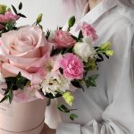 Композиция в коробке из пионовидных кустовых роз и эустомы
