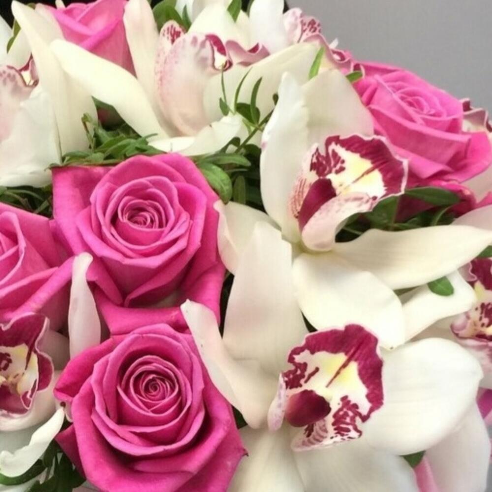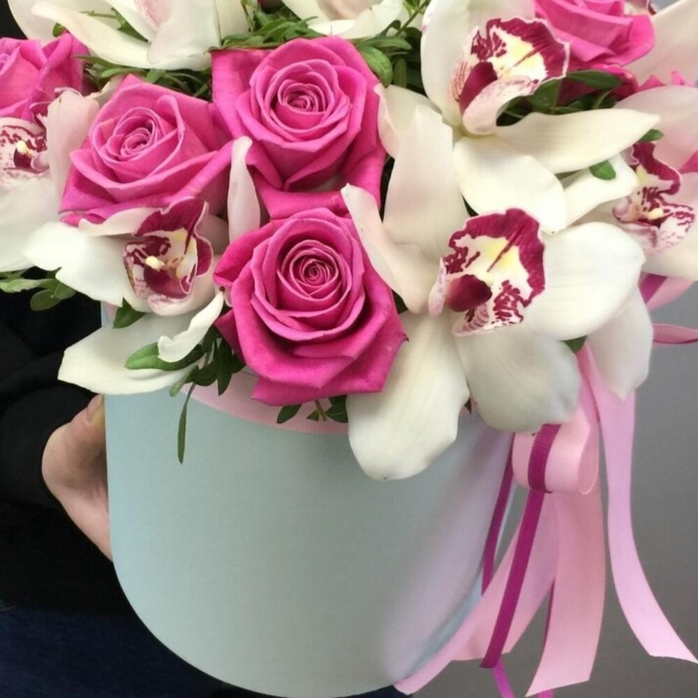 Орхидея Цимбидиум – 10 шт.Роза – 11 шт.Лента атласная – 1 шт.Шляпная коробка – 1 шт.Губка флористическая – 2 шт.зелень декоративная – 4 шт.