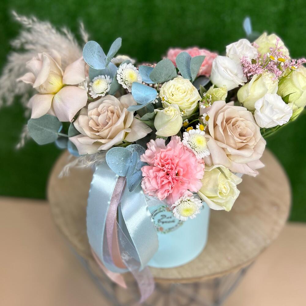 Роза кустовая – 2 шт.Эвкалипт – 6 шт.Ромашка – 1 шт.Эустома – 2 шт.Диантус – 2 шт.Коробка шляпная – 1 шт.Сухоцветы – 2 шт.Роза Мента – 3 шт.Губка флористическая – 1 шт.