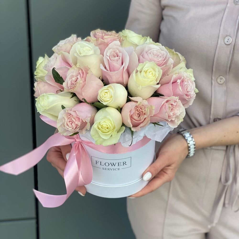 Роза розовая – 15 шт. Роза белая – 10 шт. Коробка – 1 шт. Оазис – 1 шт.