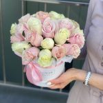 “Атлас☁️” – цветочная композиция с зефиром в деревянном ящике