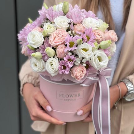 Коробка Цветочная поляна из хризантемы, кустовой розы и эустомы