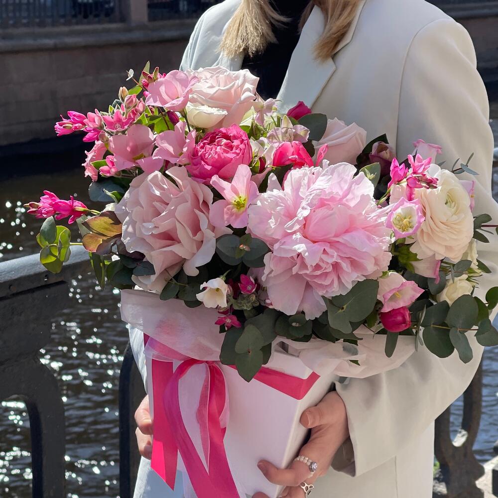 Тюльпан – 1 шт.Роза кустовая – 1 шт.иксиа – 4 шт.Ранункулюс – 1 шт.Оксипеталум – 2 шт.Кампанула – 2 шт.Роза одноголовая – 4 шт.Пион – 1 шт.Оазис – 1 шт.Тишью – 1 шт.Лента – 2 шт.Коробка трапеция – 1 шт.