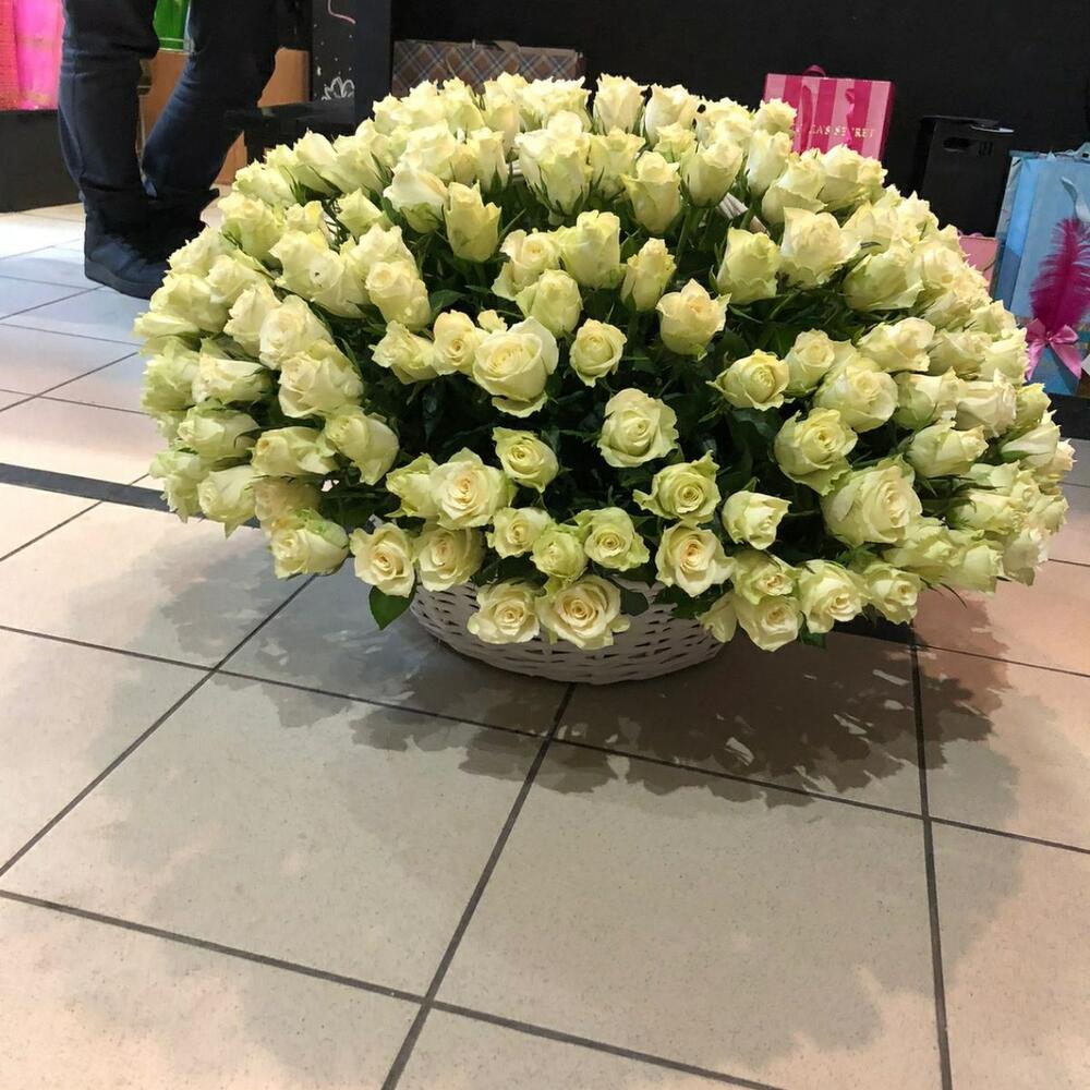 Роза белая – 255 шт.Корзина плетеная – 1 шт.Оазис флористический – 6 шт.