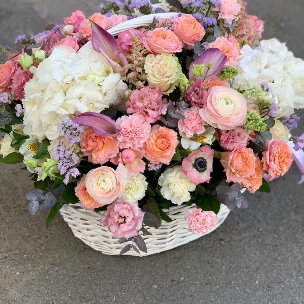 Корзина – 1 шт.Оазис – 3 шт.Гортензия – 2 шт.Ранункулюс – 2 шт.Кустовая пионовидная роза – 7 шт.Эустома – 5 шт.Маттиола – 3 шт.Калла – 5 шт.Кустовая роза – 5 шт.Статица – 7 шт.Астильба – 3 шт.Гвоздика – 11 шт.Эвкалипт – 5 шт.белые розы – 5 шт.