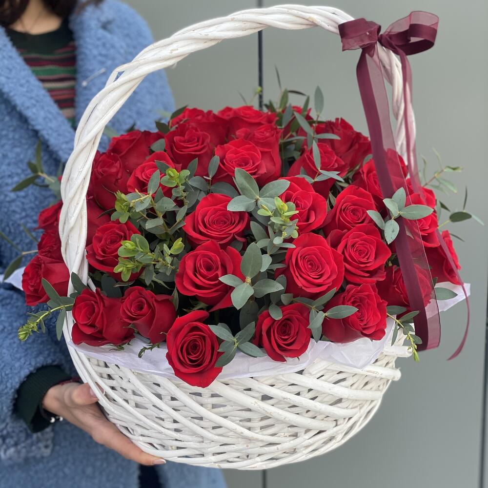 красная роза фридом – 51 шт. Эвкалипт – 3 шт. Корзина – 1 шт. Оазис – 4 шт.