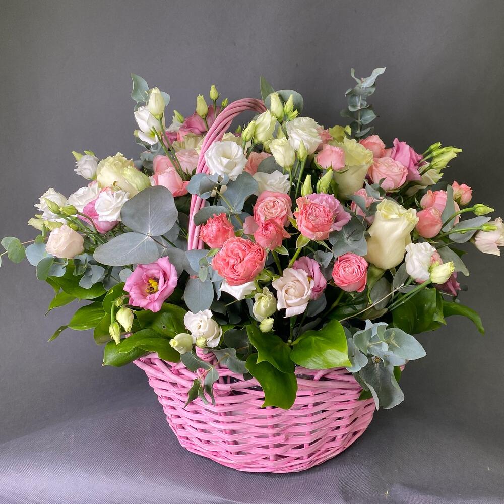 Корзина пион роз, диантуса и эвкалипта «Бал цветов»
