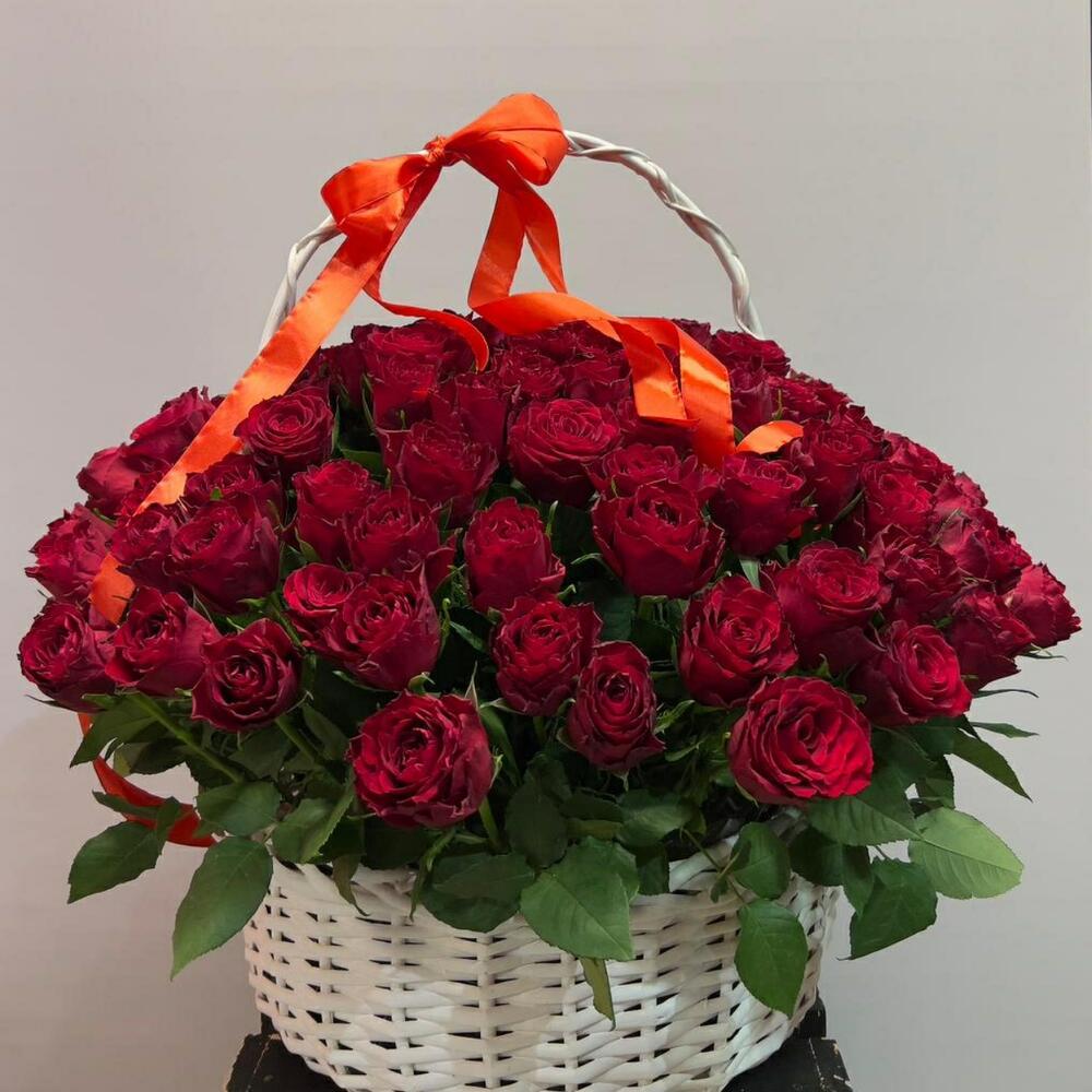 Метки: 101 роза, от 5000 руб, цветы в корзине