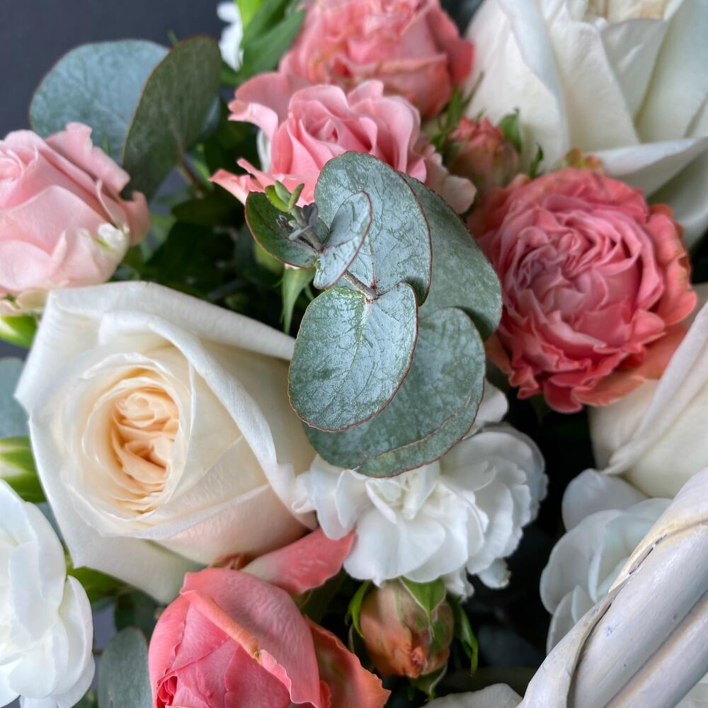 Роза кустовая – 3 шт.Диантус – 9 шт.Роза Мондиаль – 4 шт.Губка флористическая – 1 шт.роза канделайт – 3 шт.эвкалипт ветка большая – 2 шт.корзина плетеная ива средняя – 1 шт.