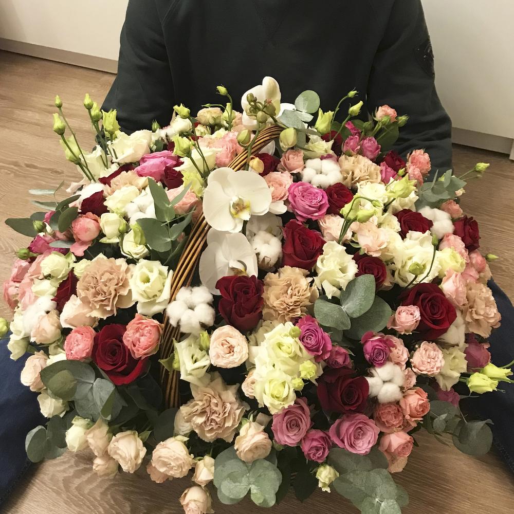 роза премиум эквадор – 25 шт.Диантус – 20 шт.Эвкалипт – 15 шт.Хлопок натуральный – 12 шт.роза кустовая “мисс бомбастик” – 10 шт.роза кустовая “бомбастик” – 10 шт.роза кустовая “мадам бомбастик” – 10 шт.роза кустовая “леди бомбастик” – 10 шт.эустома “алиса вайт” – 10 шт.орхидея “фаленопсис” – 2 шт.Оазис флористический – 4 шт.Корзина плетеная – 1 шт.