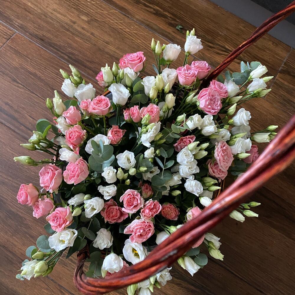 Лизиантус – 10 шт.Роза кустовая – 15 шт.Эвкалипт – 7 шт.Корзина плетеная – 1 шт.Оазис флористический – 1 шт.