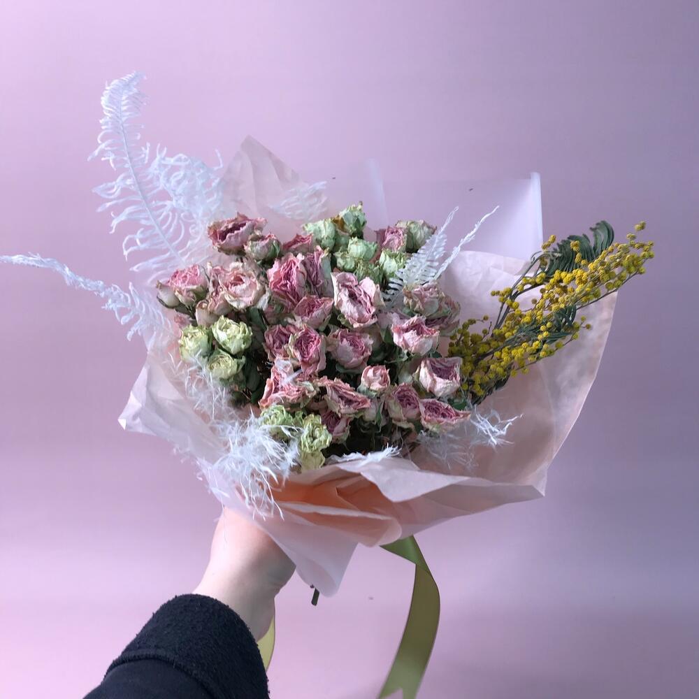 Крафт пакет – 1 шт.Оформление – 1 шт.Ковыль – 2 шт.стабилизированный аспарагус – 2 шт.засушенные розы – 11 шт.