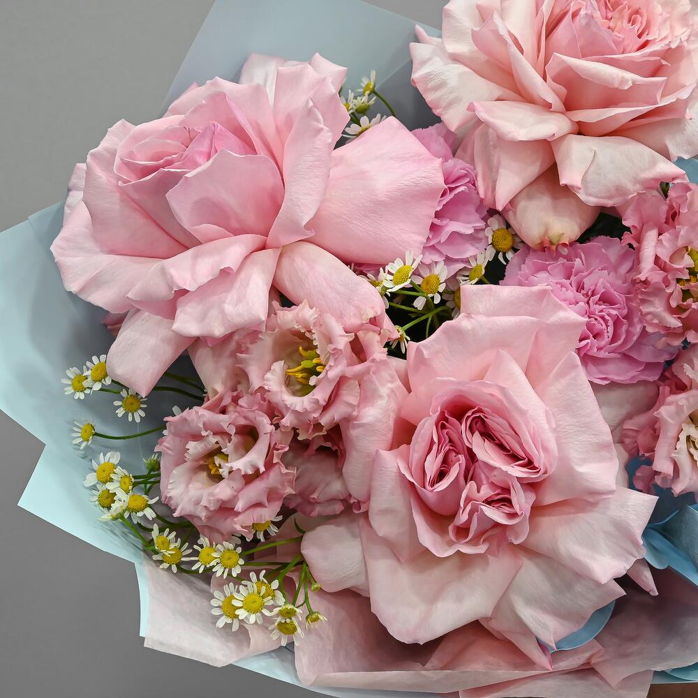 Категории: Гвоздики, Лизиантусы, Розы, Ромашки