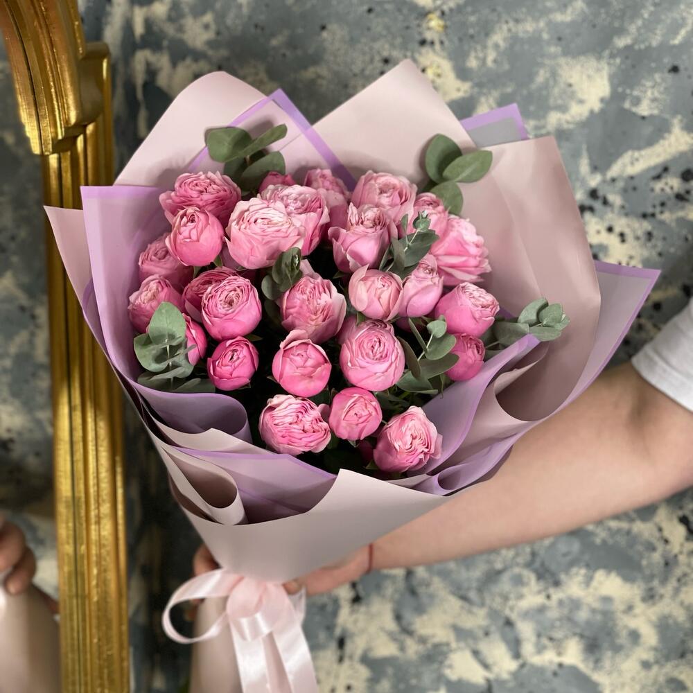 роза кустовая пионовидная сильва пинк – 7 шт.Эвкалипт – 3 шт.Пленка матовая – 4 шт.Лента атласная – 2 шт.