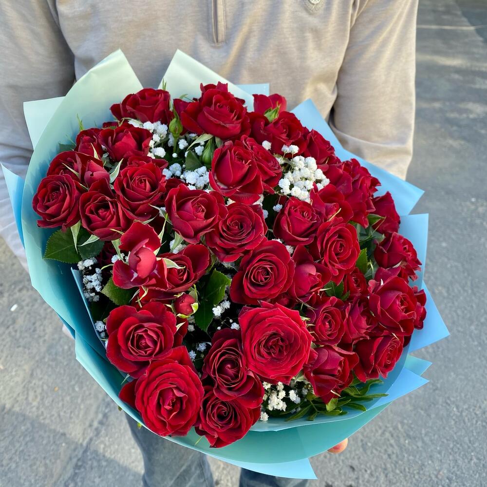 Роза кустовая – 19 шт.Гипсофила – 1 шт.Упаковка дизайнерская – 1 шт.Лента атласная – 1 шт.
