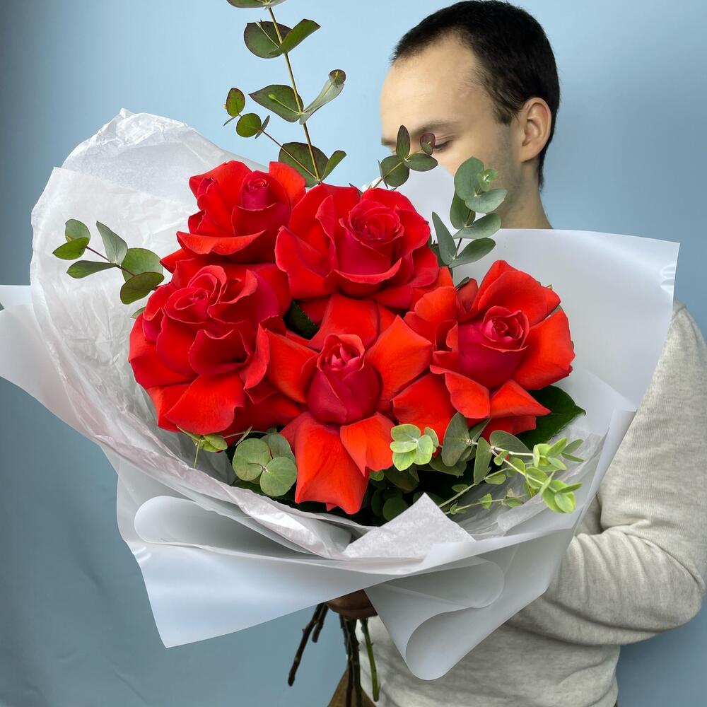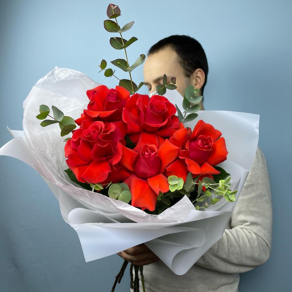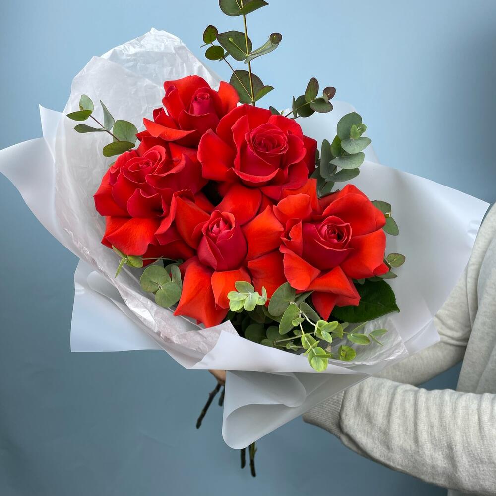 Эвкалипт – 2 шт.Лента атласная – 1 шт.Тишью – 1 шт.Упаковка дизайнерская – 1 шт.Французская роза – 5 шт.