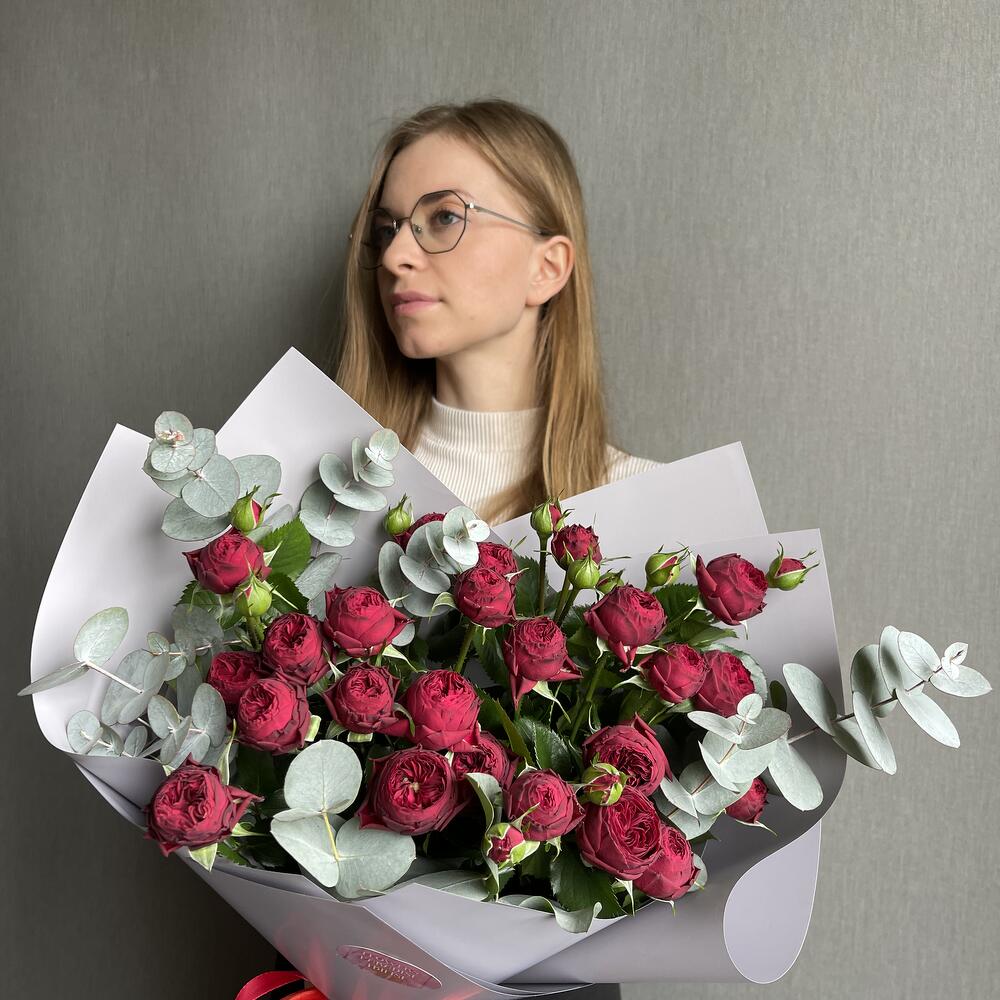 Этот яркий букет состоит из кустовых красных роз и может быть украшен зеленью и другими дополнительными элементами, чтобы придать ему более выразительный вид.