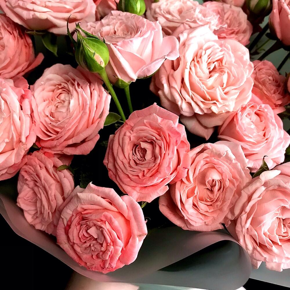 Лента атласная – 1 шт.Пленка матовая – 6 шт.кустовая пионовидная роза мадам бомбастик – 7 шт.