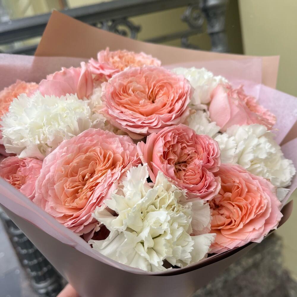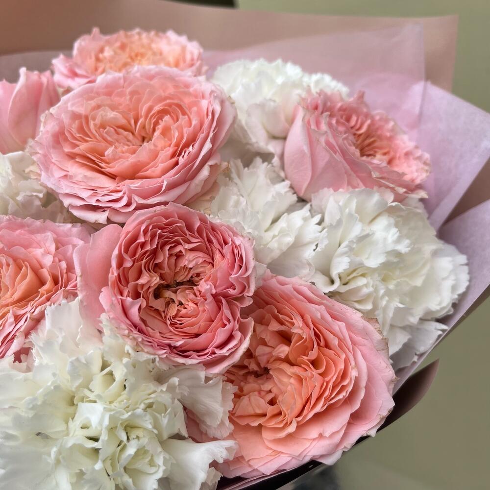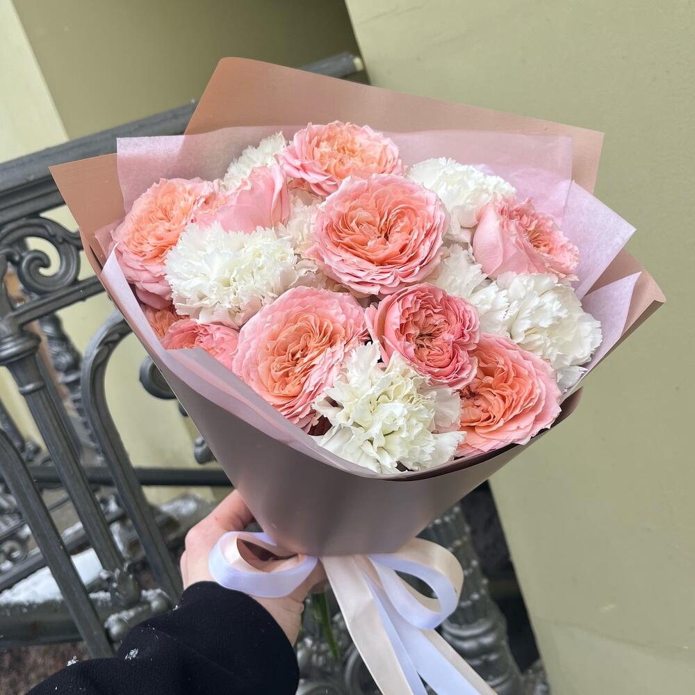 Лента атласная – 2 шт.Упаковка корейская пленка – 1 шт.диантус белоснежный – 9 шт.тишью нежно-розовое – 1 шт.роза премиум пионовидная джульетта – 4 шт.