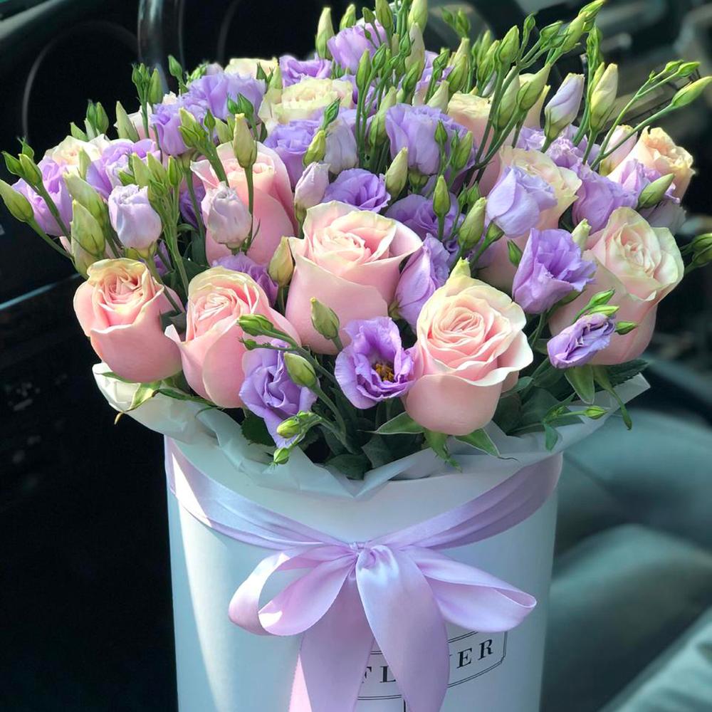 Чудесная композиция в коробке из нежных оттенков роз и лиловых эустом.