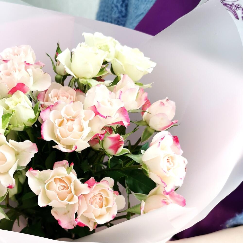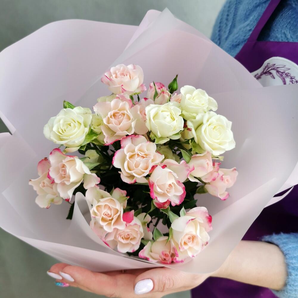 Нежный букет с кустовой розой в стильной дизайнерской упаковке