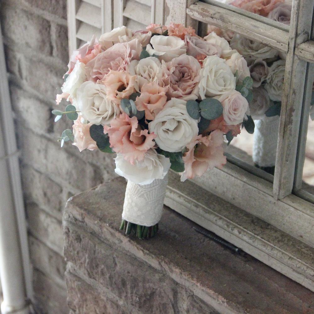 Роза голландия сортовая – 11 шт.лизиантус априкот – 7 шт.Роза кустовая – 5 шт.Эвкалипт – 4 шт.Фисташка – 4 шт.Кружево – 1 шт.