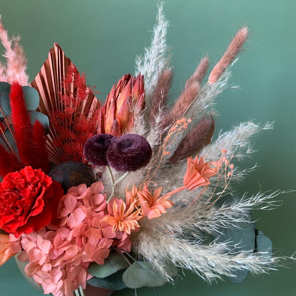Кашпо керамическое – 1 шт.Роза стабилизированная – 1 шт.пампасная трава – 5 шт.Эвкалипт стабилизированный – 2 шт.Лагурус (сухоцвет) – 12 шт.Нигелла сухоцвет – 5 шт.пальма пика – 1 шт.Оазис флористический – 1 шт.листья магнолии – 2 шт.гербера сухоцвет – 2 шт.аспарагус стабилизированный – 3 шт.гортензия стабилизированная – 1 шт.сетария сухоцвет – 3 шт.Протея африка – 1 шт.