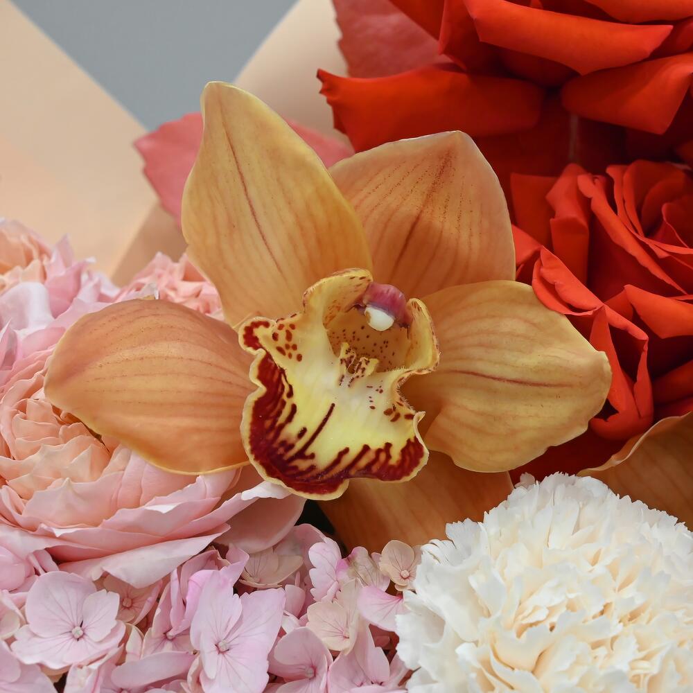 Французская роза – 7 шт.Эустома – 3 шт.Рускус – 7 шт.Гвоздика – 7 шт.Пионовидная кустовая роза – 5 шт.Нутан – 3 шт.Гортензия – 1 шт.ЦИМБИДИУМ – 5 шт.Аралия – 1 шт.Магнолия – 2 шт.Аспарагус – 2 шт.Упаковка дизайнерская – 1 шт.