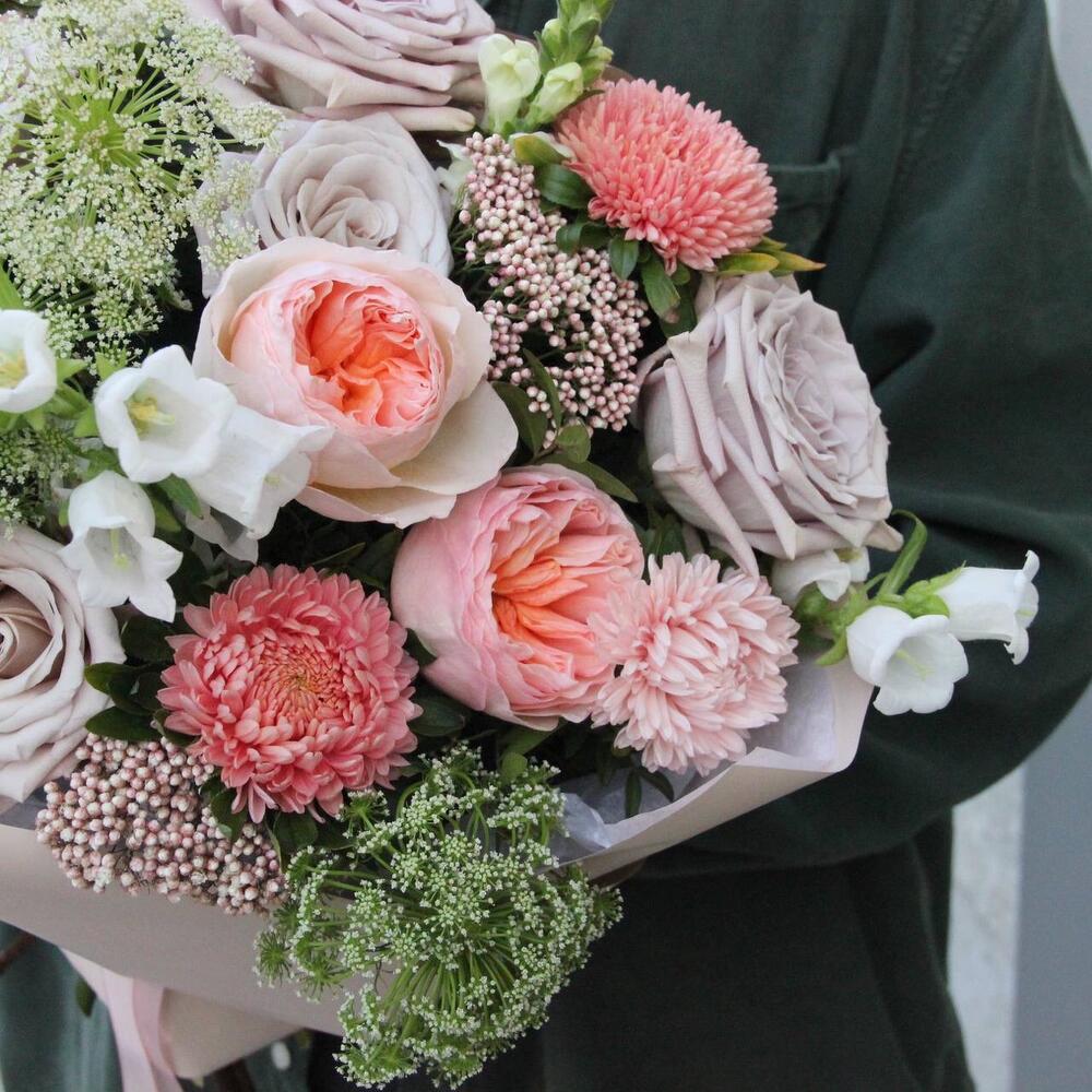 Авторский букет с английскими розами, зонтиками, колокольчиками, астрами и озотамнусом.Стильное цветочное решение для любого случая.